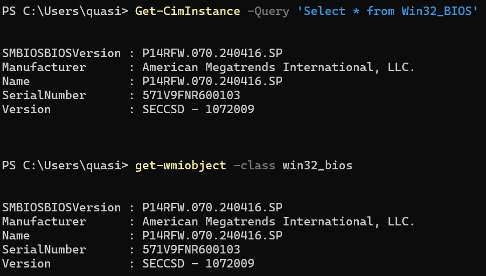문법은 약간 다르지만 출력하는 정보는 wmiobject와 같은것을 확인할 수 있다.
