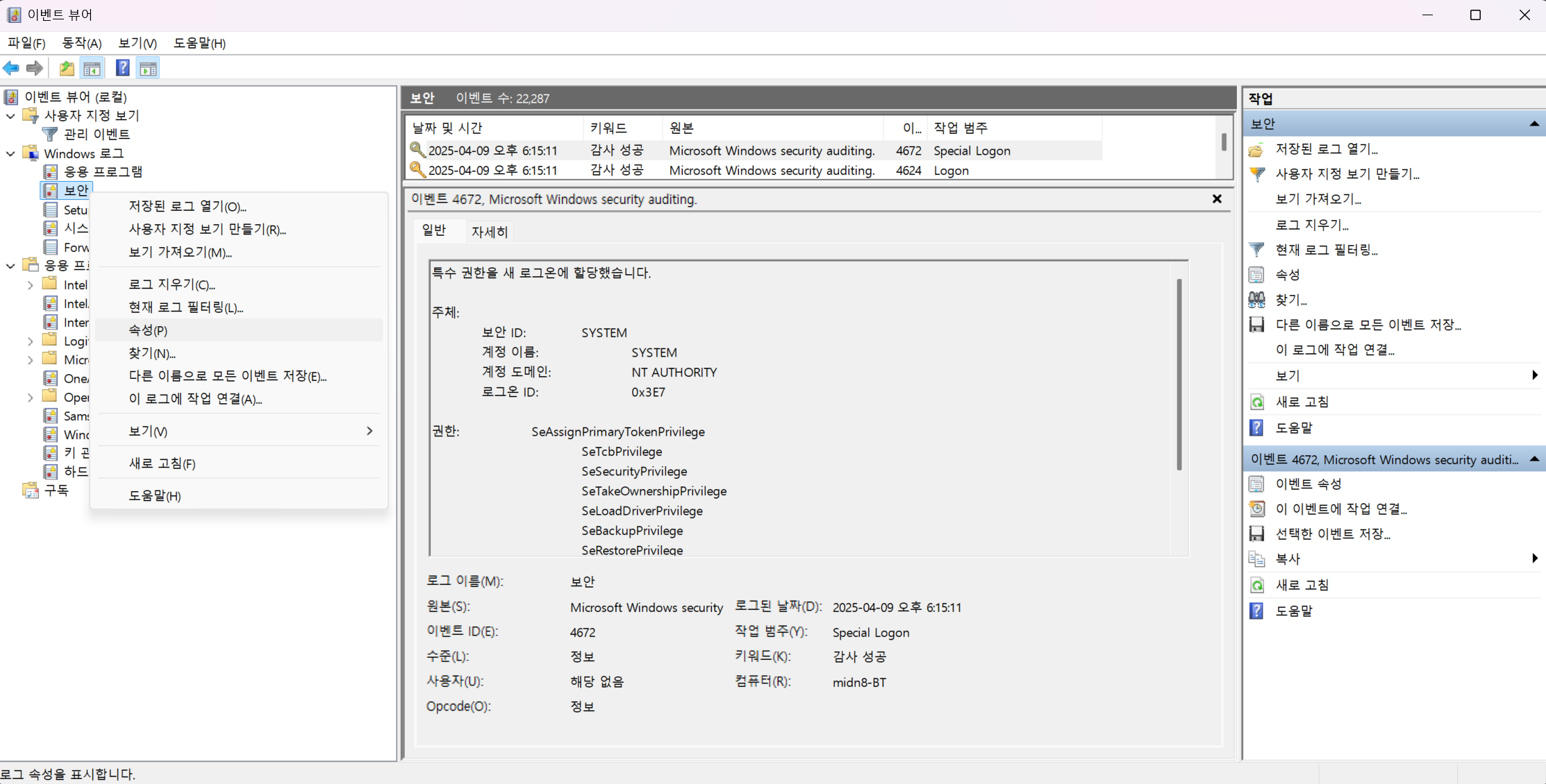 eventvwr.msc 를 실행 후 관심있는 이벤트에 오른쪽 클릭 - 속성