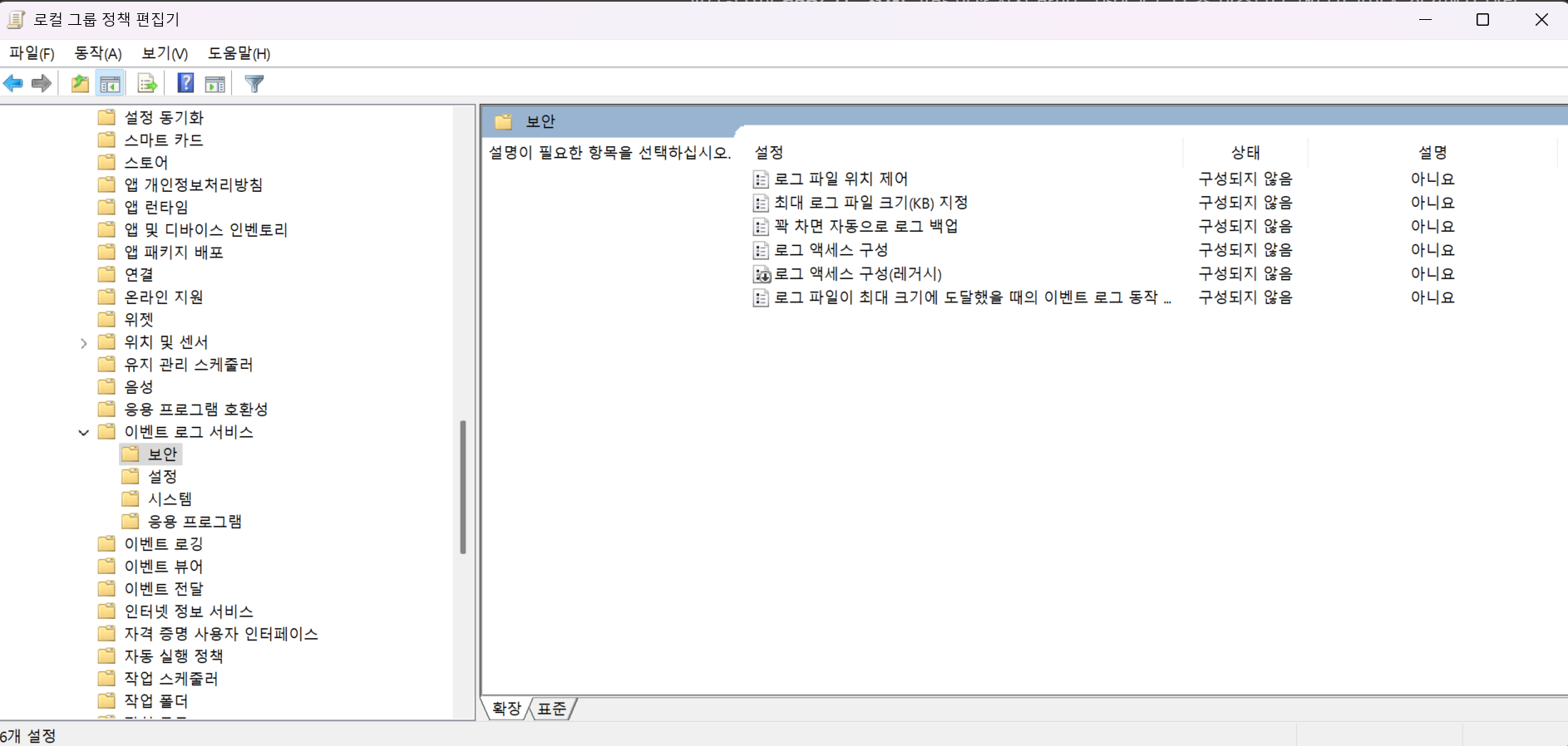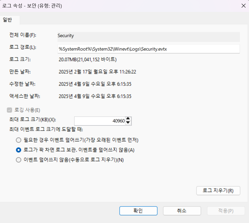 최대 로그 크기를 변경해주고, 로그가 꽉 차면 로그 보관, 이벤트를 덮어쓰지 않음 옵션도 체크해주자.