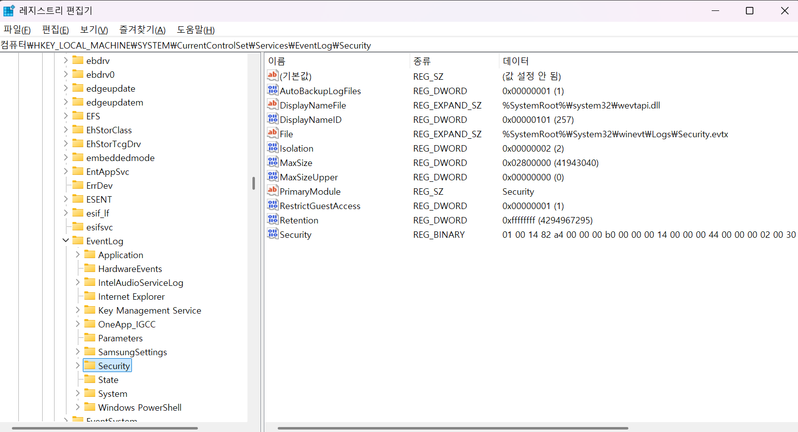 HKEY_LOCAL_MACHINE\SYSTEM\CurrentControlSet\Services\Eventlog\<로그이름>\