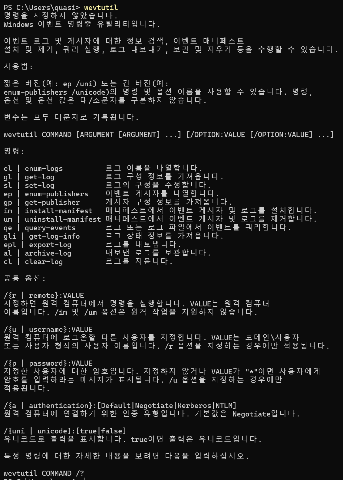 파워쉘에서 wevtutil을 사용할 수 있다. 여기서 우리가 관심있는 것은 sl 옵션이다.
