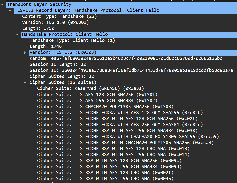 Cipher Suites 항목을 보면 된다. 총 16개의 알고리즘을 지원하고, 하나당 2byte의 hex 데이터로 표현한다. 따라서 총 크기는 32bytes다.