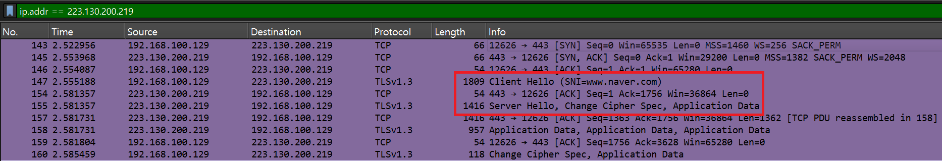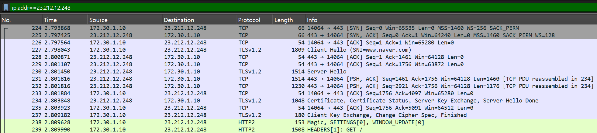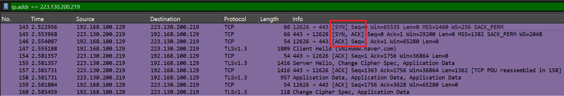 네이버 IP로 패킷을 필터링했다. 가장 먼저 3-way handshake가 보인다.