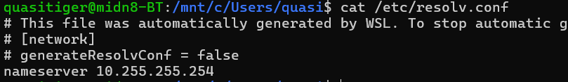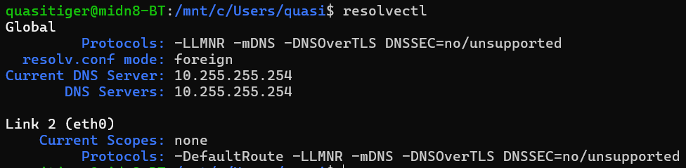 리눅스 시스템에서는 resolvectl 명령 또는 /etc/resolv.conf 를 사용함으로써 알 수 있다. 현재 아래 리눅스 시스템은 wsl이고, dns 서버 주소가 사설 ip 대역인것 으로 봐서 아마 호스트로 passthrough 되어있지 않을까 하는 생각이 든다.