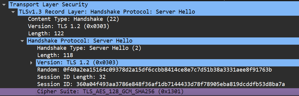 그러면 서버는 자신이 지원하는 암호화 알고리즘과 대조 후 최신의 적당히 빠르면서 안전한(아마도) 알고리즘을 선택해서 "응 그러면 우리 이렇게 암호화 해서 통신하자" 하고 알려준다. 바로 다음처럼 말이다