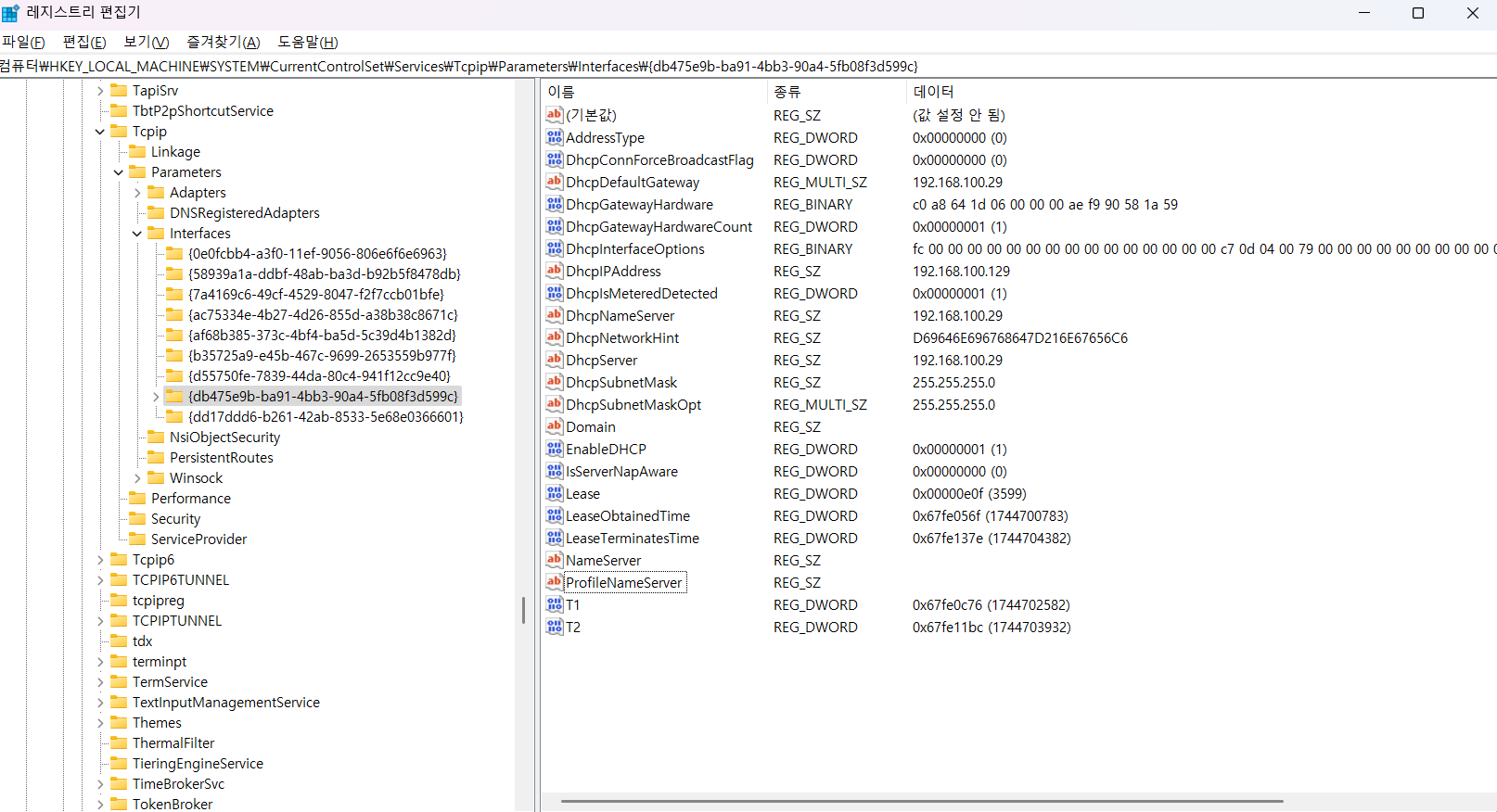 레지스트리의 해당 NIC 부분을 확인하면 된다. 현재 IP 설정이 Static이라면 NameServer에 기록되겠지만 DHCP이므로 DhcpNameServer에 기록되었다. 192.168.100.129는.. 핸드폰에서 쓰는 DNS 서버인가..? (참고로 필자는 현재 스벅에서 핫스팟을 쓰고있다. 내통신사 KT :) )