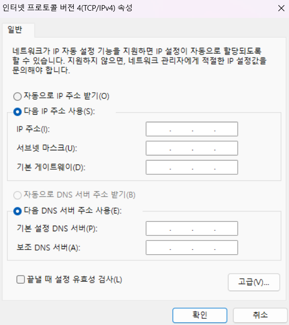 윈도우 운영체제에서 IP 설정을 하다보면 위와 같은 창을 볼 수 있다. IP주소 설정칸 밑에 DNS 서버 주소 사용 칸이보이는가? 이 칸이 바로 DNS 서버 주소를 설정하는 공간이다.