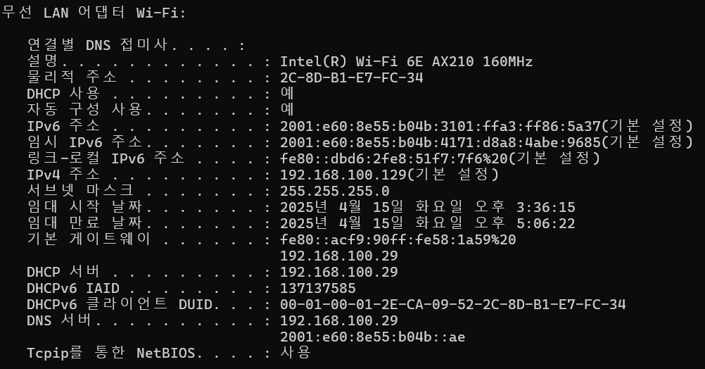ipconfig /all 명령을 사용하거나 또는