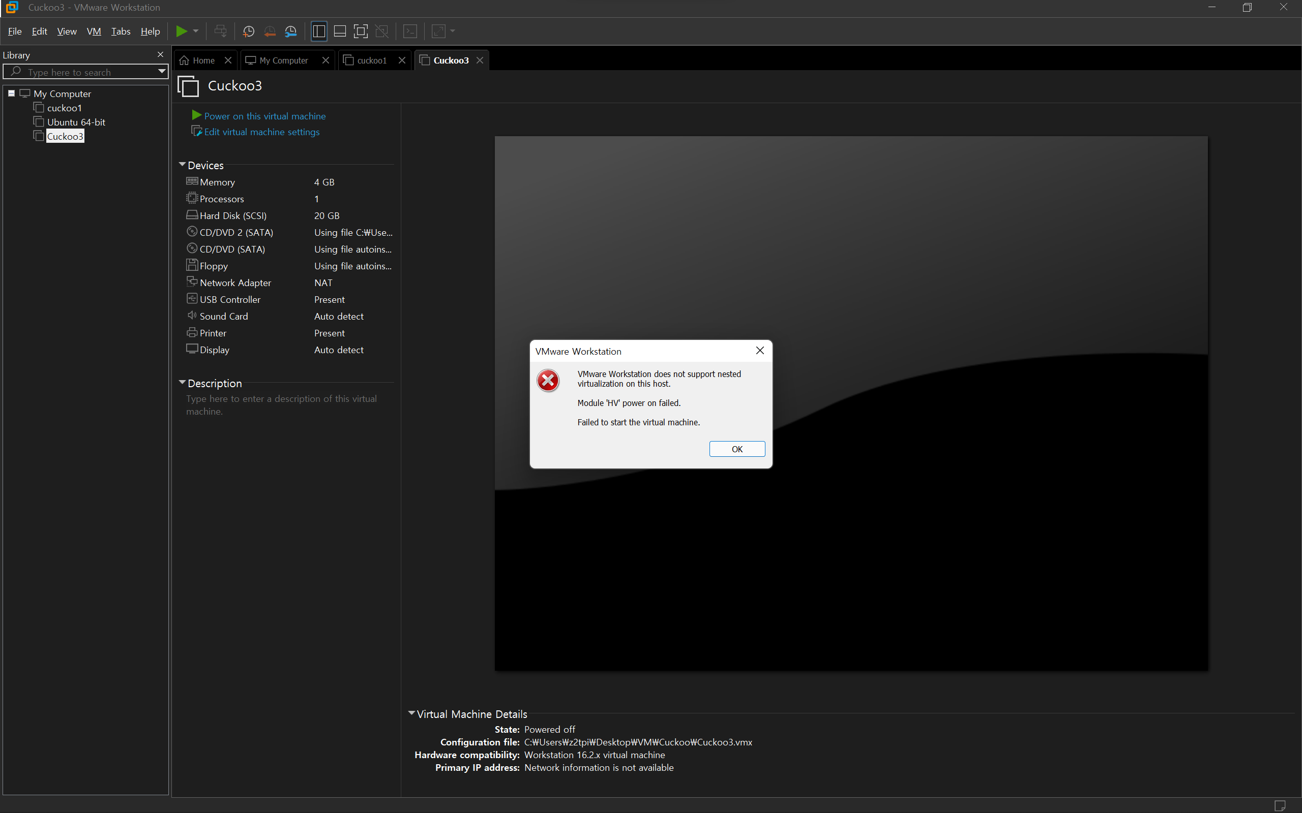 VMware Workstation does not support nested virtualization on this host. Module 'HV' power on failed. Failed to start the virtual