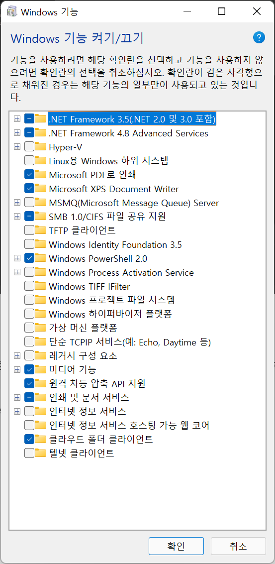 윈도우키+R 을 누른다음 optionalfeatures 입력 후 엔터를 누르면