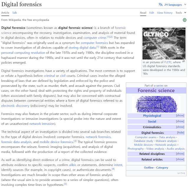 그렇다 실제로 디지털 포렌식 기술이 활용되는 분야를 본다면 가장 먼저 생각나는 범죄수사. 범죄수사에서는 컴퓨터 모바일 장치 등을 자주 분석할 것 같다(아마도). 그리고 해킹사고를 분석하는 침해사고 대응, 그다음 로펌에서 다루는 e-discovery 등이 생각난다.