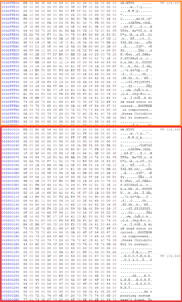 자 우리가 확인하려고 하는 VBR 데이터는 3,300,000 에서 시작하는 섹터 104,448에 있다. 그런데이상하게 바로 위 섹터에도 VBR같은 데이터가 기록되어 있는 것을 볼 수 있다. 저것은 도대체 무엇이란 말인가..