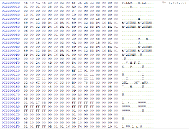위 사진과 같이 $MFT 엔트리의 시그니쳐 'FILE'을 확인할 수 있다.