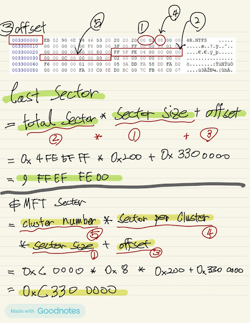 $MFT Sector = Cluster Number * Sector per Cluster * Sector Size + offset