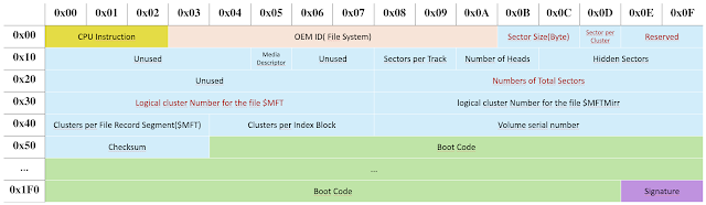 여기서 본격적인 파티션 정보를 확인할 수있다. 주된 정보로는 섹터 크기, 클러스터 당 섹터 수, $MFT의 위치, 전체 섹터 수 등이 있다. 상세한 데이터 테이블은 다음과 같다.