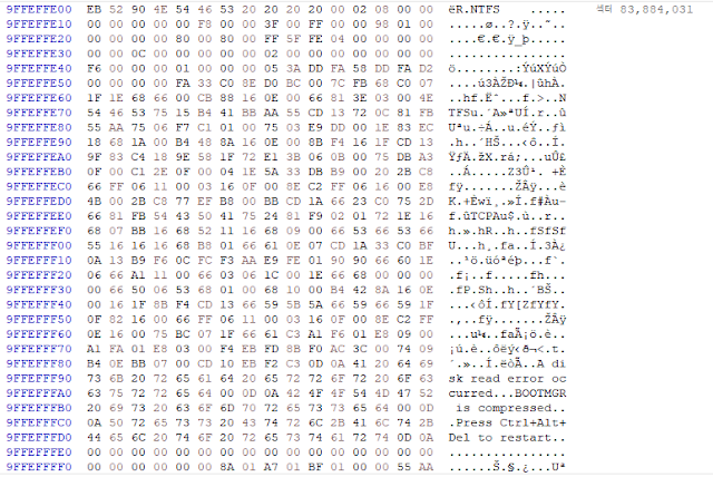 JAVA Bootstrap 과는 다른 Boot Strap이다. 여기서 부트 코드가 동작해 실제 메모리에 커널을 적재하는 역할을 한다. 오른쪽 스트링 데이터에서 에러 메세지와 BOOTMGR, Ctrl+Alt+Del 등을 확인할 수있다.
