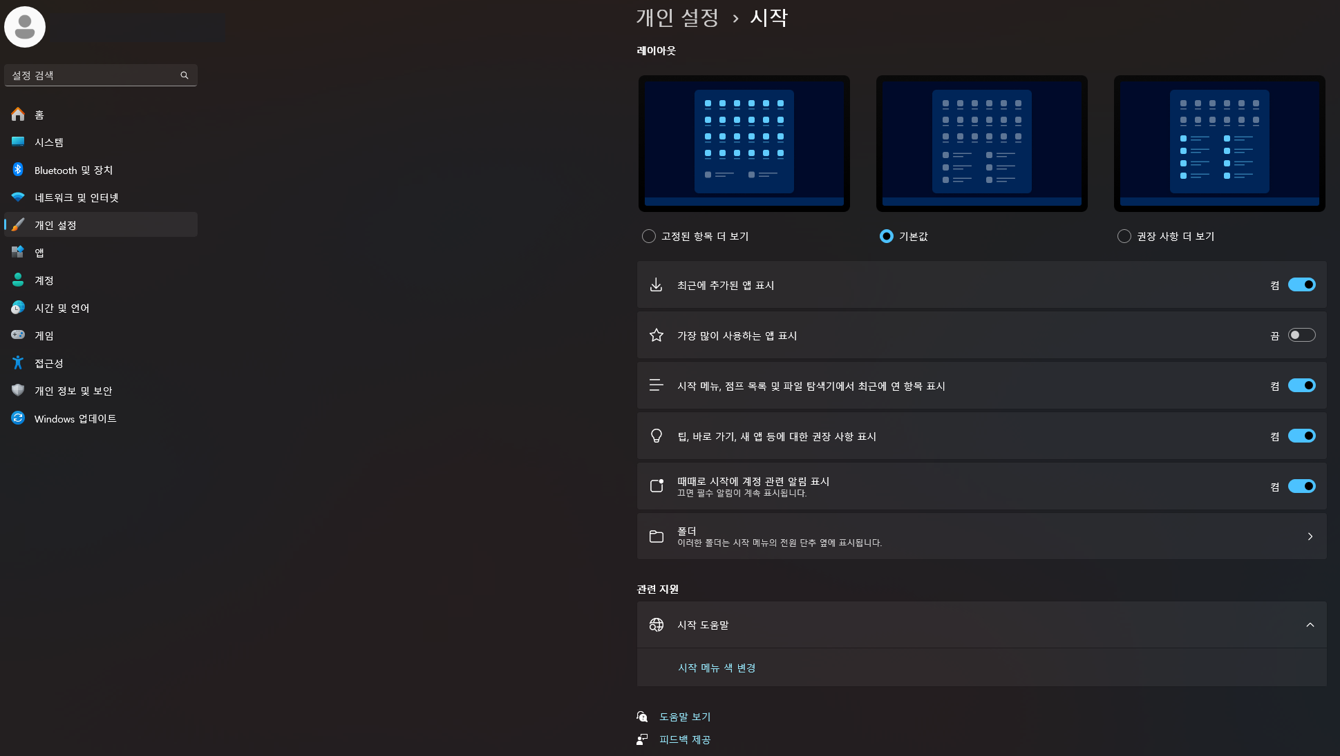 윈도우 11에서는 시작 아이콘 오른쪽 클릭 -> 설정 -> 개인 설정 -> 시작 메뉴, 점프 목록 어쩌고 저쩌고를 끄면 된다.