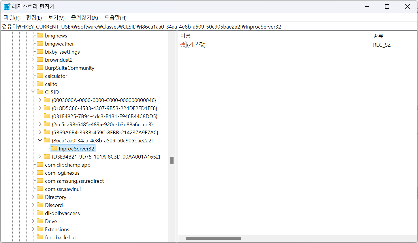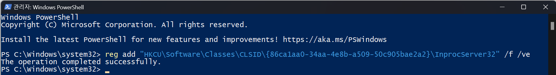 위 명령에서 /f 는 강제(force) 덮어쓰기, /ve 는 해당 키를 빈(empty) 값으로 생성한다는 의미다.