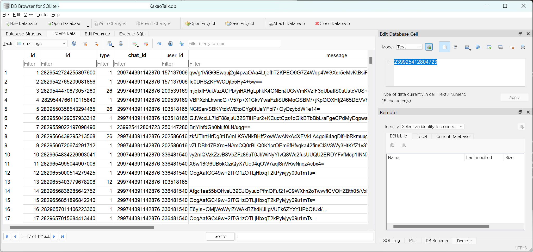 데이터베이스를 열어 살펴보면 chat_logs 테이블에서 다양한 정보들을 확인할 수 있는데 'message' 컬럼을 보면 base64로 encode 되어있는 것을 볼 수 있다.