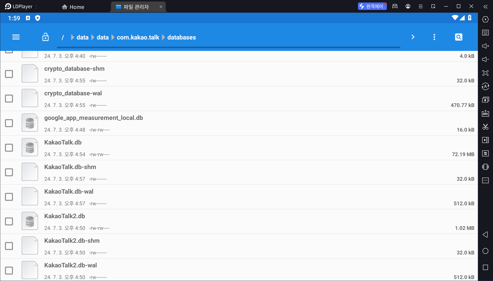 3. 파일 관리자를 열어 /data/data/com.kakao.talk/database 경로로 이동한다.