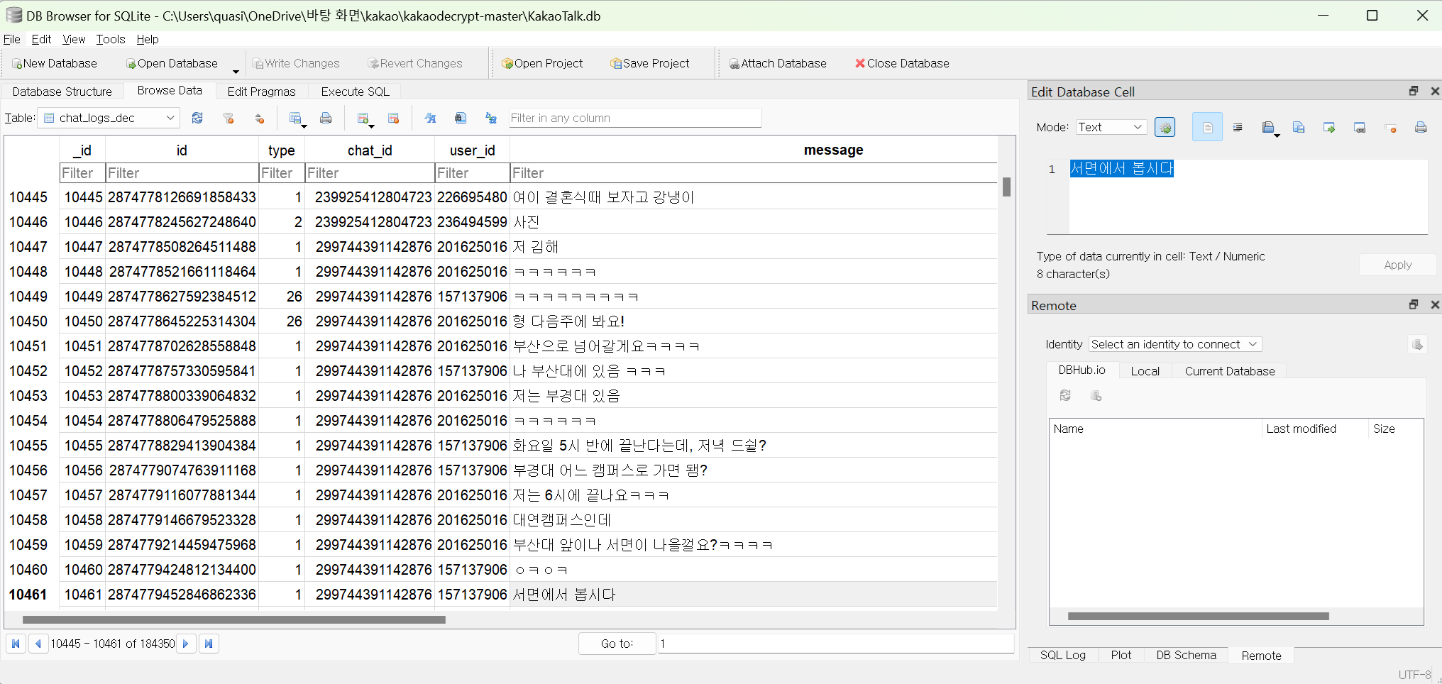 이렇게 대화내역이 복호화된 평문 데이터를 볼 수 있다.