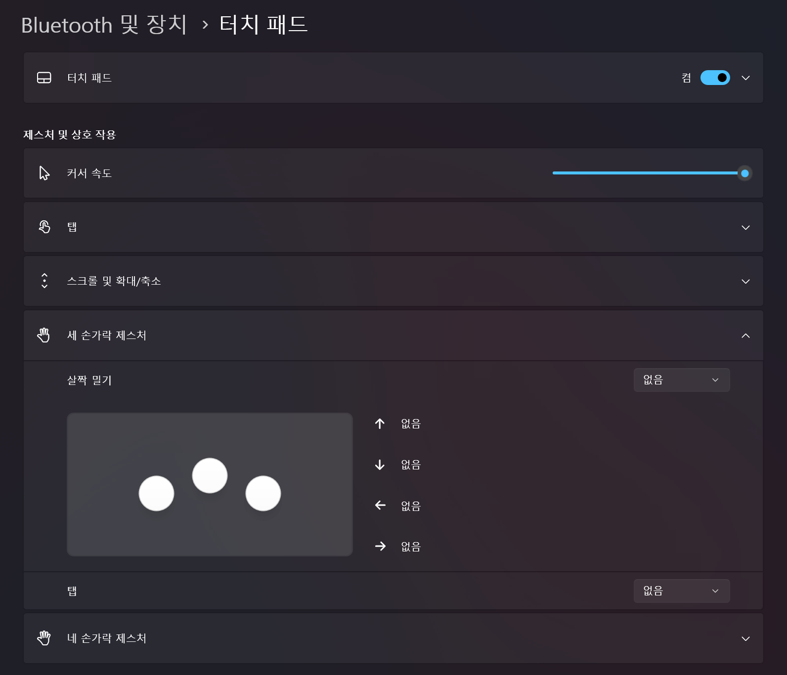 그리고 반드시 윈도우 설정에서 세손가락 터치 설정을 없음으로 바꿔주어야 한다.