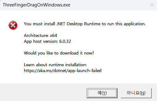 그런데 사용하려면 닷넷 런타임이 필요하다. 저런 경고창이 나오면 예(Y)를 눌러주자.