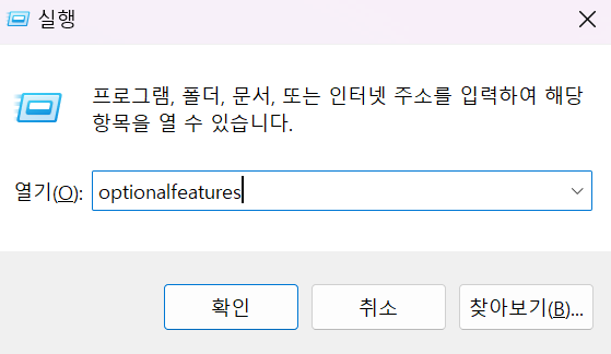 win + r 을 누른 다음 optionalfeatures 를 입력 후 엔터,