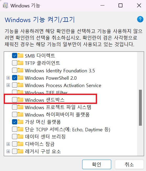 여기서 'Windows 샌드박스'를 찾아 체크하고 '확인'을 눌러주면 된다.
