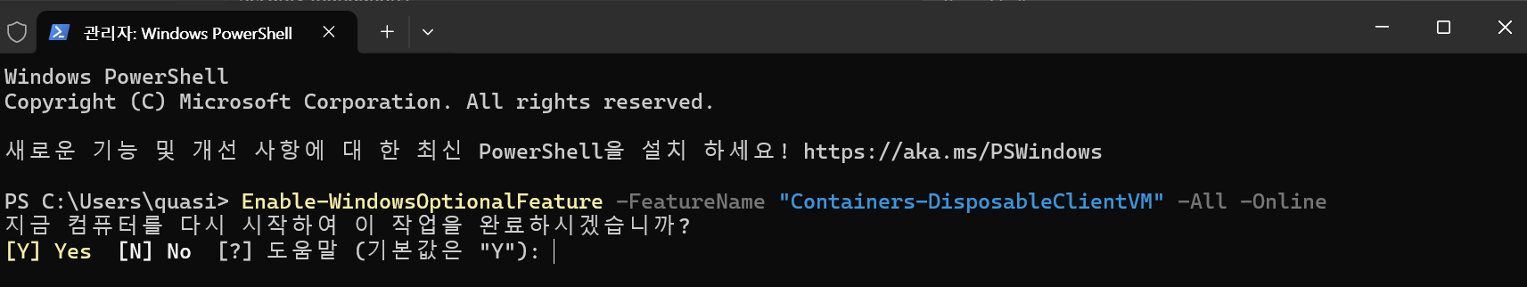 옵션 활성화 후에 'Y'를 입력해 컴퓨터를 재시작 해 주자.