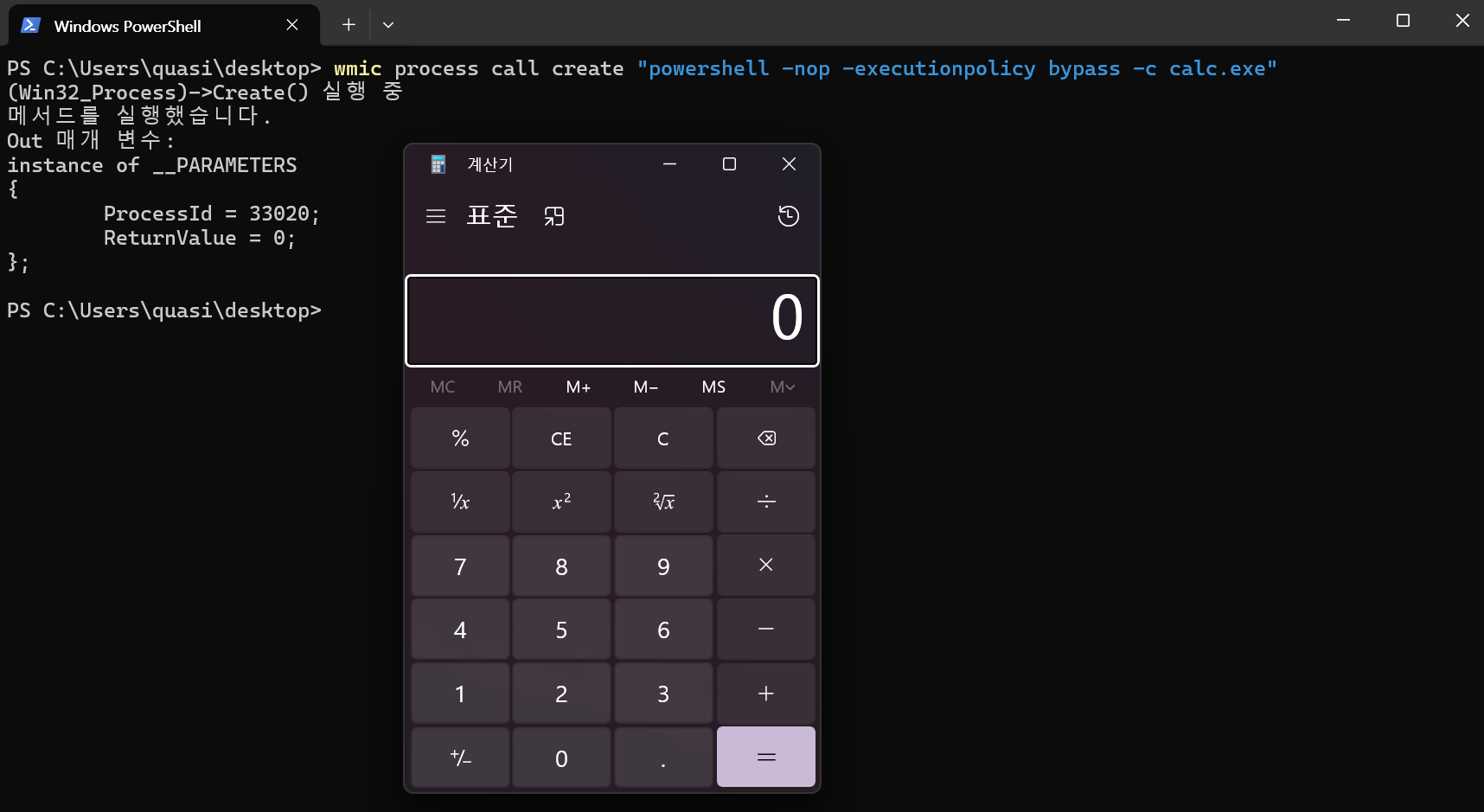 wmic process call create "powershell -nop -executionpolicy bypass -c calc.exe"