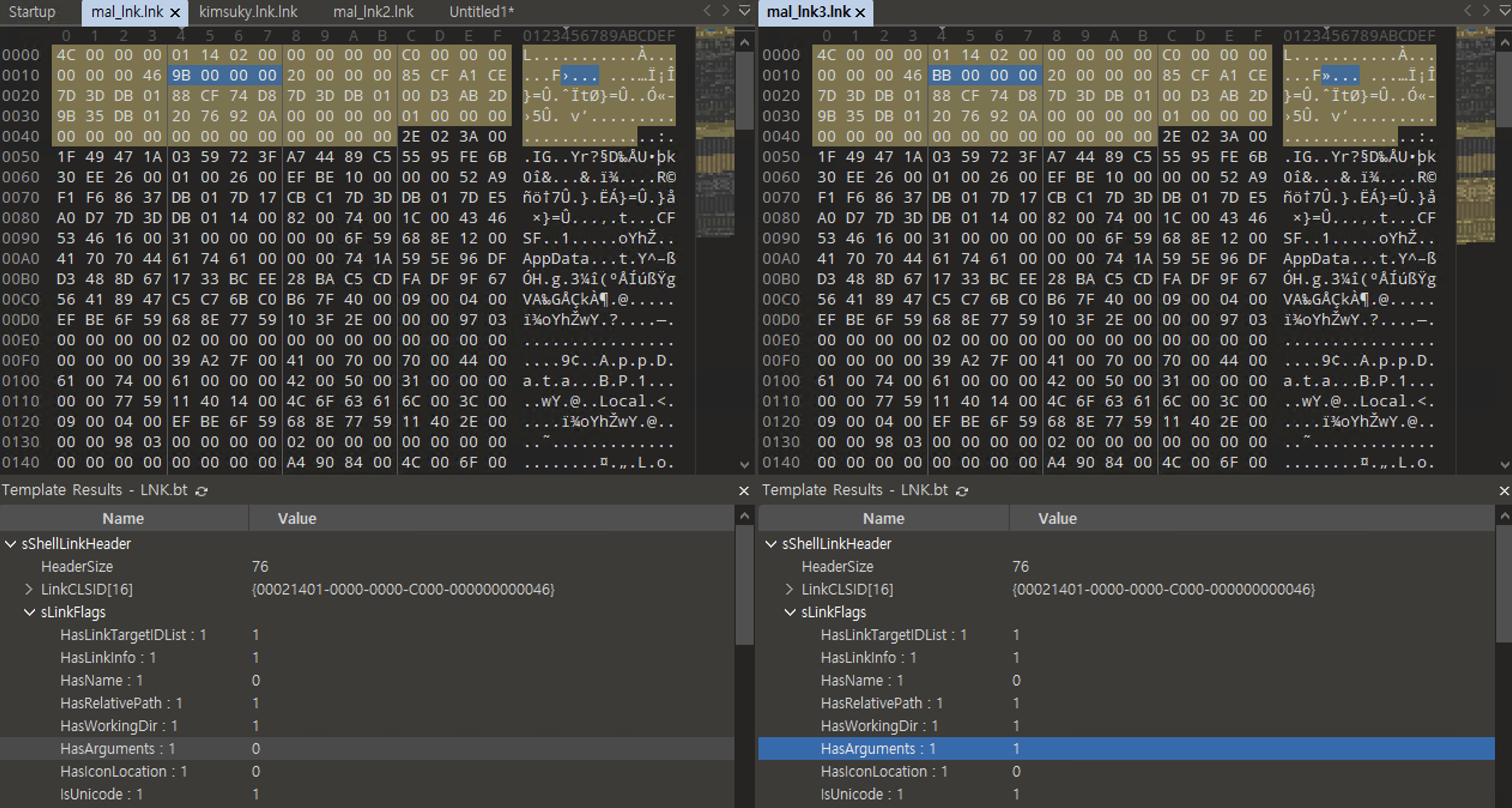 hxd로 링크파일을 오픈하니 원본 파일이 나와서 이렇게 xxd를 사용해 데이터를 확인해보았다. 여기는 ShellLinkHeader로 시각 정보를 포함하고 있기 때문에 포렌식적으로도 중요한 의미를 가지고 있다. ShellLinkHeader에서 우리가 주의깊게 보아야 할 부분은 바로 이 0x14~0x17 영역이다. 이 영역은 LinkFlags라 불리며, 아래 010edit 이미지를 보면 알겠지만 다양한 flag를 가지고 있다. 그리고 이 flag설정에 의해 값이 변화한다. 그 중 우리는 추가적인 명령 전달을 위해 HasArguments 플래그를 활성화 시켜야한다.