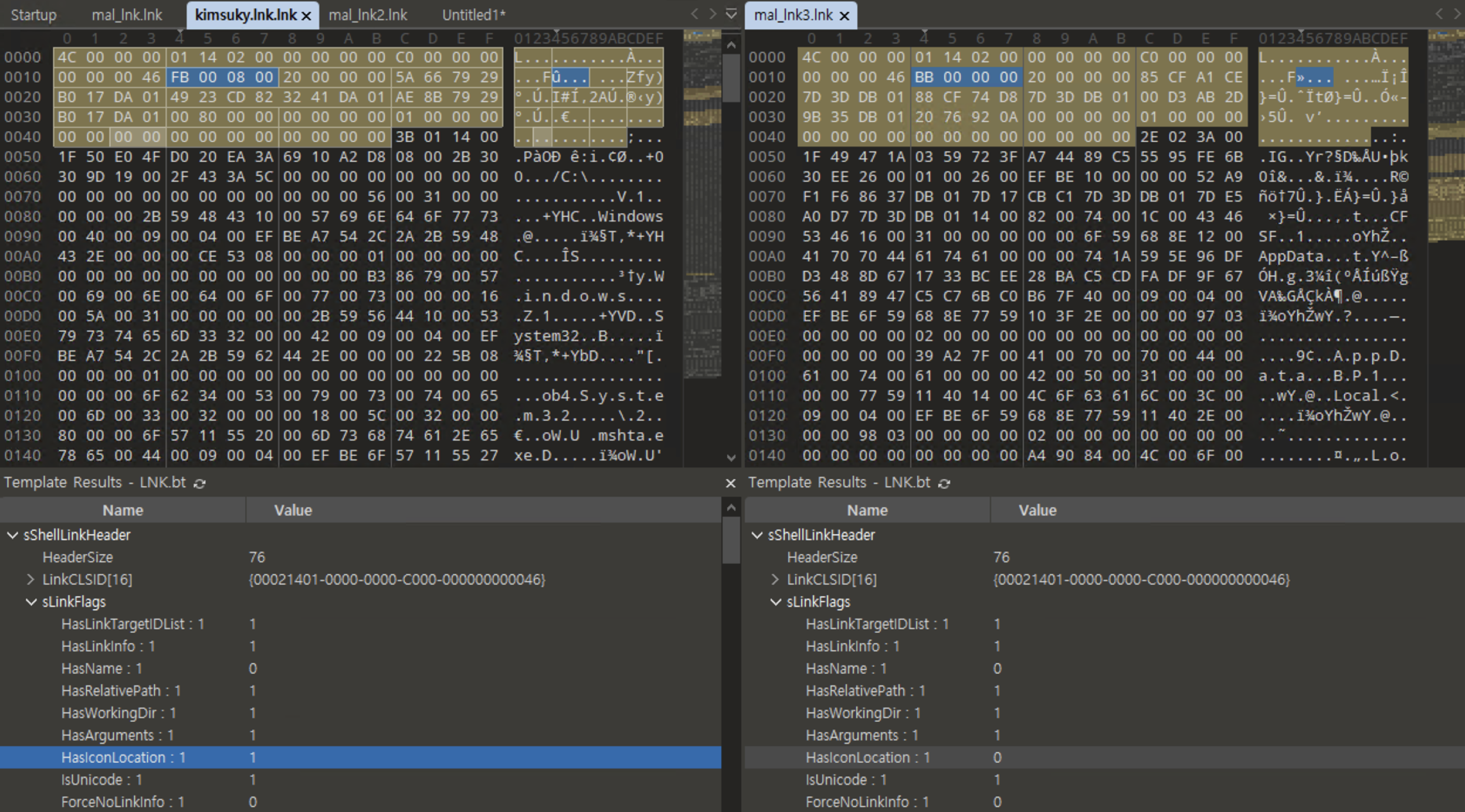 또 kimsuky 샘플에서 보이는 것 처럼 fake icon을 입히기 위해 HasIconLocation 플래그도 활성화 시켜 주어야 한다.