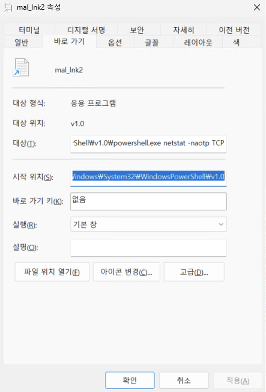 그런데 분석 중에 가만히 생각해보니, 엄한 lnk 파일을 변경시키는거보다 그냥 lnk 파일을 만들어서 그냥 아이콘을 바꿔주고 명령을 입력해주면 되는거 아닌가? 하는 생각이 들었다. 당장 해보자. 파워쉘 링크 파일을 생성한 후 대상(T) 칸에 내가 좋아하는 netstat -naotp TCP 명령을 입력해 주었고, 또 아이콘을 txt 로 바꾸어주었다.