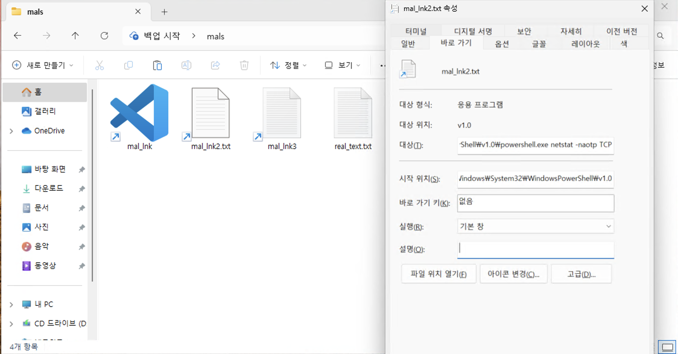 아이콘 왼쪽 하단에 화살표 표시가 있다면 링크 파일로 의심해볼 수 있다. 그리고 보통 문서 파일들에는 이런 화살표가 붙지 않는다. real_text.txt 파일처럼 말이다.