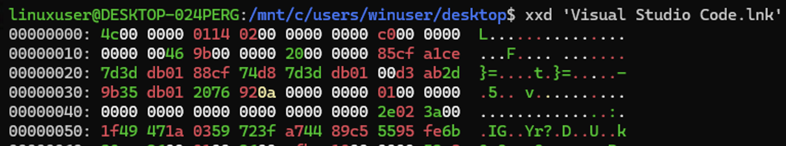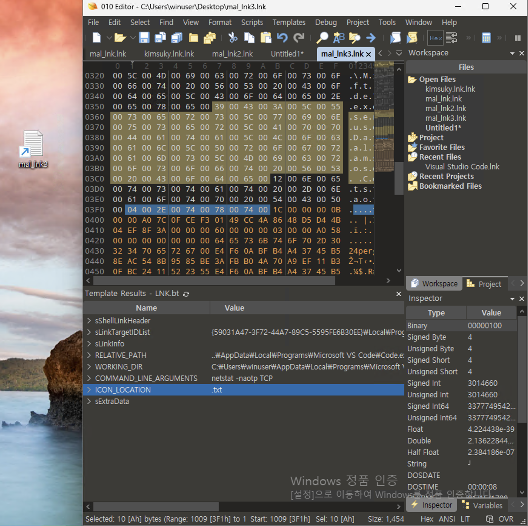 HasArguments 플래그와 HasIconLocation 플래그 활성화 후 값을 입력한 변화는 아래 사진과 같다. vscode.exe 의 링크 파일이지만 텍스트 파일 아이콘을 가지게 되었다. 하지만 여기서 끝이 아니다. 우리가 원하는 명령을 실행 시키려면 target이 powershell이 되어야한다. 이제 target을 변경해보자.