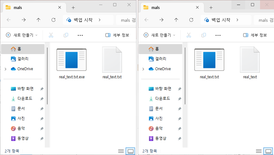 만약 오른쪽 상황에서 real_text.txt.exe 파일이 랜섬웨어 파일이고, 아이콘을 텍스트 아이콘 모양으로 변조했다면?