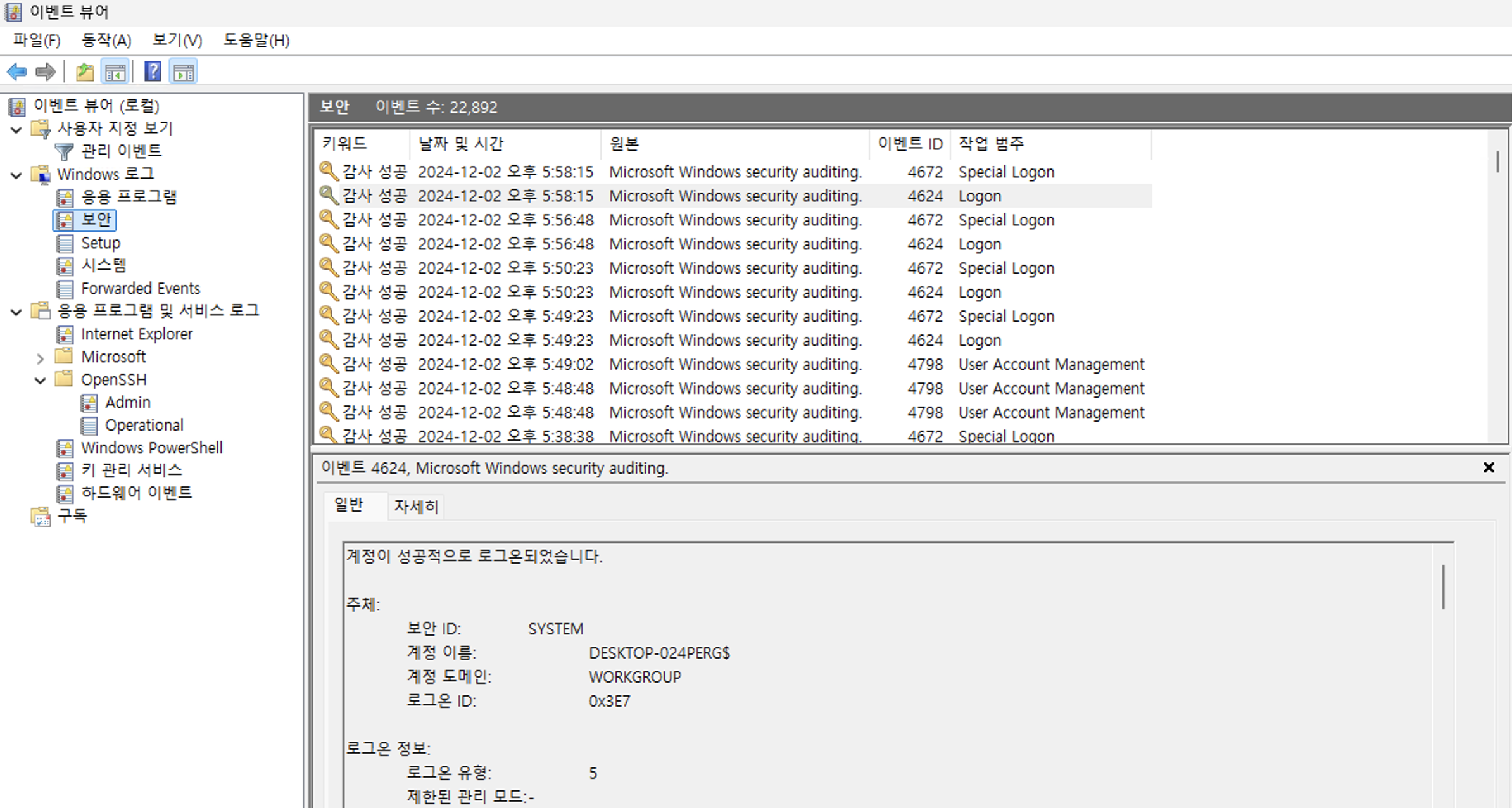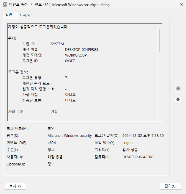 - 계정 이름 : DESKTOP-024PREG$ (이벤트를 실행한 컴퓨터 이름, $는 컴퓨터임을 의미)
