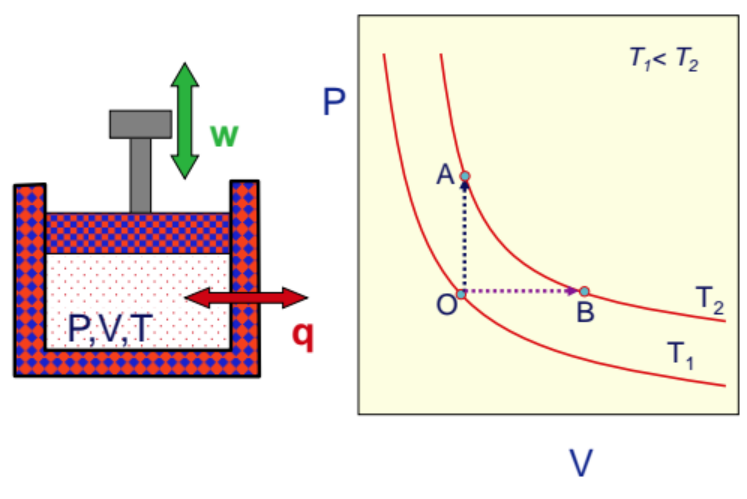 먼저 부피를 고정한다 생각하자. 만약 이상태에서 온도를 올리면 어떻게 될까?(온도를 올린다는 것은 외부에서 열을 제공한다는 것이다) 우리는 경험적으로 너무나도 잘 알고있다. 기체가 에너지를 받아 활동도가 올라가고, 이로인해 내부 압력이 상승할 것이다. 하지만 부피가 고정되어 있으므로 결국에 피스톤을 움질일 수는 없다 따라서 $w=0$ 이다. 또는 반대로 생각해도 같다. 압력을 올리면 어떻게 될까? 당연히 온도가 상승할 것이다. 바로 위 그래프의 A 경로와 같다.