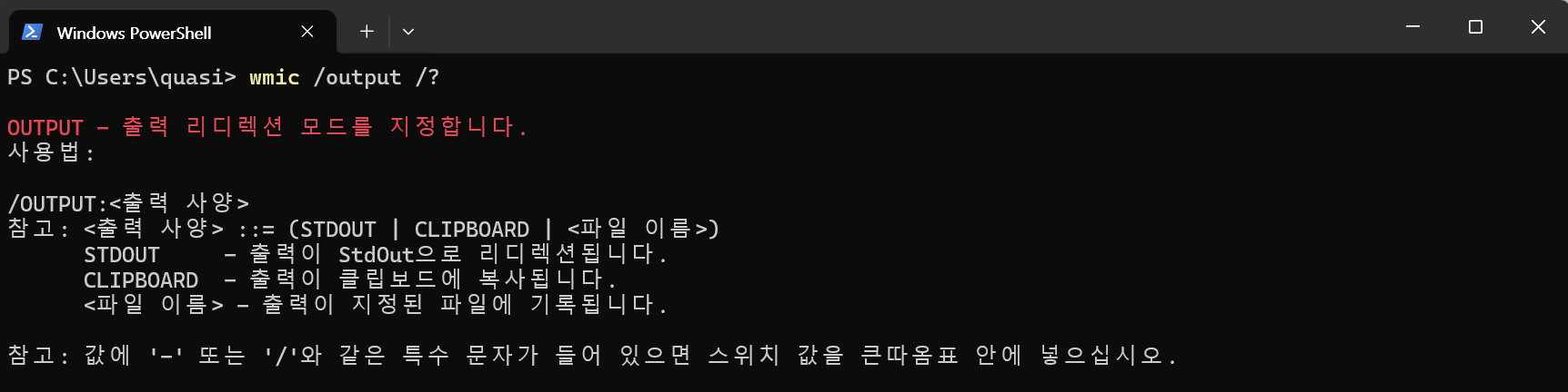 WMIC는 /? 을 함께 입력할 시 도움말을 출력해준다. 예제는 다음과 같다.