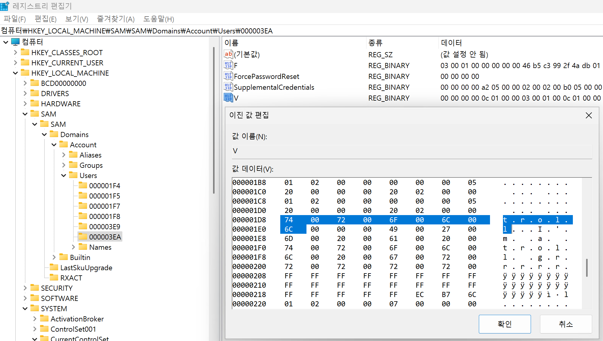 Users 키의 하위 키의 16진수는 각 계정의 RID이며 이는 사용자별로 부여되는 고유 식별자다. 그리고 V 데이터 안에는 우리가 그토록 찾아헤매던 사용자 계정 정보와 암호화된 NTLM 해시가 잠들어있다.