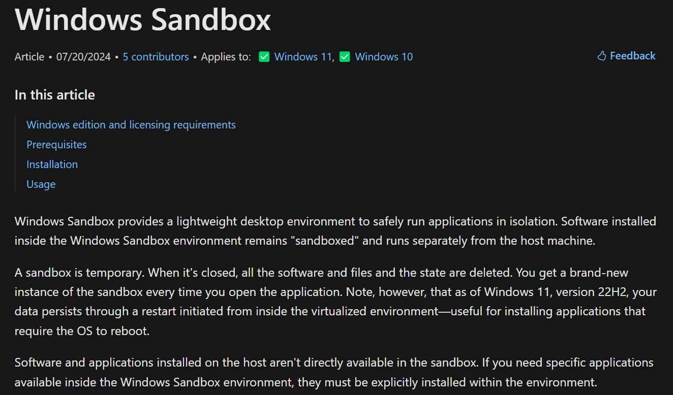 [win11] 윈도우 샌드박스(Windows Sandbox) 사용하기 - 1[win11] 윈도우 샌드박스(Windows Sandbox) 사용하기 - 2 예전에는 윈도우에서 가상환경을 사용하려면 virtual box 또는 vmware 를 사용해야했다. 그런데 최근에는 선택지가 많이 늘어났다. WSL이 등장했고, 또 윈도우 샌드박스가 등장했다. 혹자는 이제 개인 사용자는 vmware 무료로 쓸수있는데 샌드박스 그런거 왜씀? 이라고 할 수도 있다. 맞는 말이다. 그러나 또 틀린 말일수도 있다. 윈도우에서 WSL2 동작을 위해서는 Hyper-v 가 필수인데, 이 떄문에 다른 가상화 어플리케이션 즉, virtual box나 vmware workstation 동작이 이 매우 매우매우 느려진다는 단점이 발생한다. ..